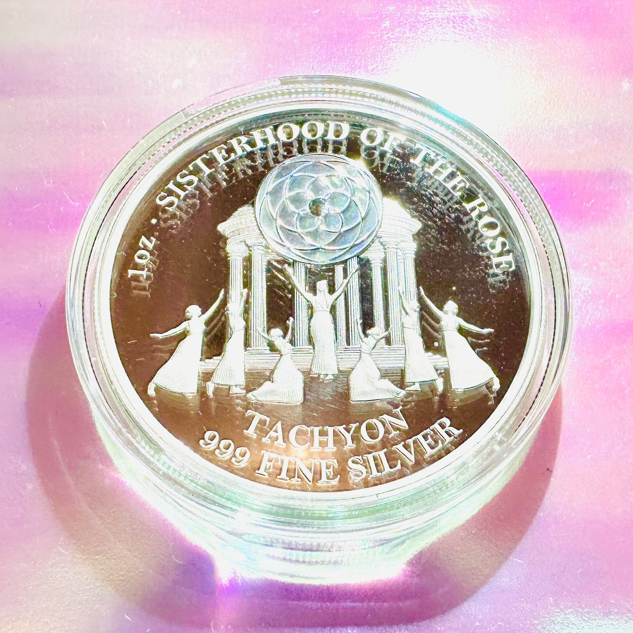 スロベニアの**「オリジナル・タキオンチェンバー(New Energy Tachyon)」**にて、恒久的な光の処理(タキオン化)を施された、純銀製の女神コインです。